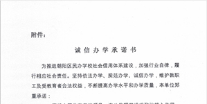 为推进朝阳区民办学校社会信用体系建设,加强行业自律,履行相应社会责任。坚持依法办学、规范办学、诚信办学,维护教职工及受教育者合法权益,不断提高办学水平和办学质量,本单位郑重承诺